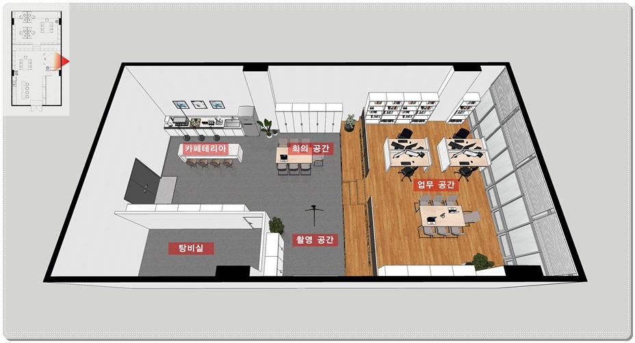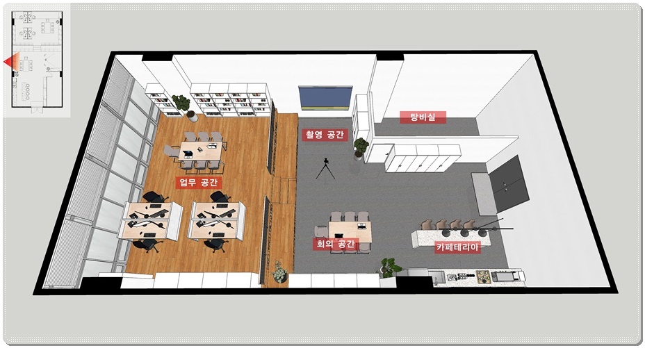 오늘 소개해드릴 디자인설계는 촬영공간을 함께 구성해야하는 개성있는 사무실로 각 기능을 분리하면서 좁아 보이지 않도록 하는 것이 포인트입니다. 그래서 공간을 업무 공간과 그 외 공간으로 나눠 단차를 높여 영역을 분리했고 그 외 공간에는 촬영실, 회의실, 카페테리아를 통합형으로 구성했으며 창고로 사용할 수 있는 탕비실 공간은 가벽을 적용해 내부를 가렸습니다.