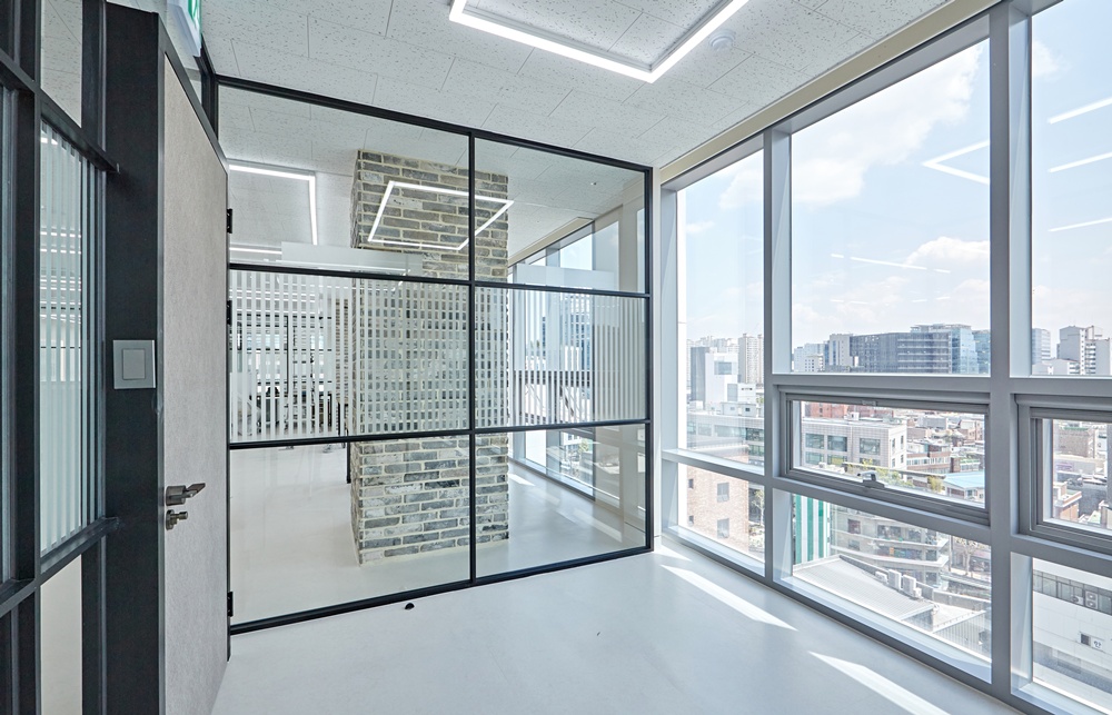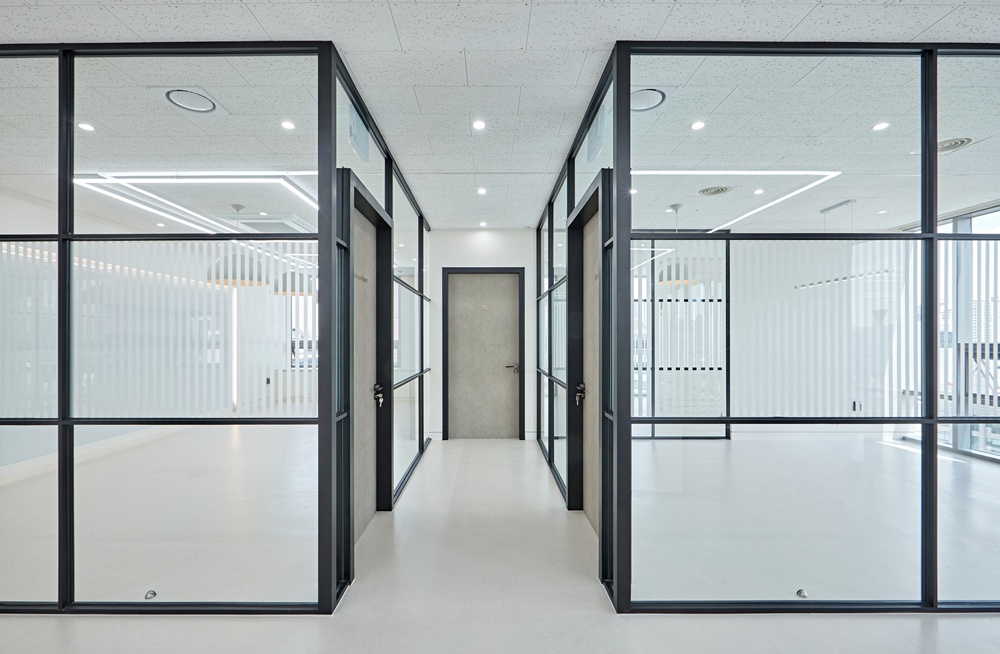 파티션 대신 투명한 유리나 목재를 사용하여 공간을 구분하기도 합니다.