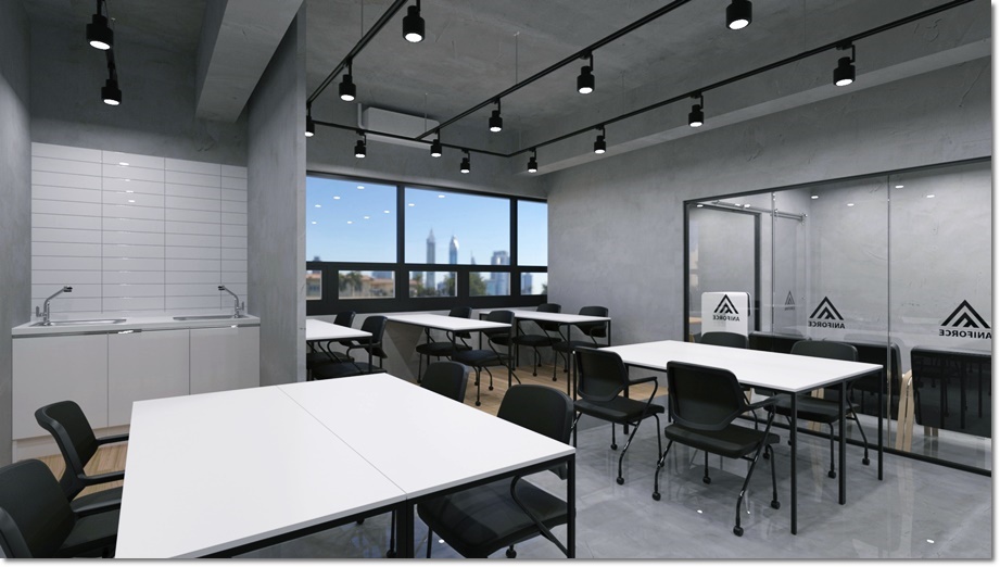 노출천장에는 레일형 조명을 적용해 특별한 인테리어 없이도 세련되고 감각적인 분위기를 조성할 수 있도록 했고 구석에까지 크게 적용해 구석에도 충분한 조도를 확보할 수 있도록 했습니다. 레일형 조명은 위치와 각도를 조절할 수 있다는 장점이 있으므로 추후 책상 배열을 바꾸거나 부분만 사용하는 상황에 얼마든지 유연하게 활용할 수 있답니다.