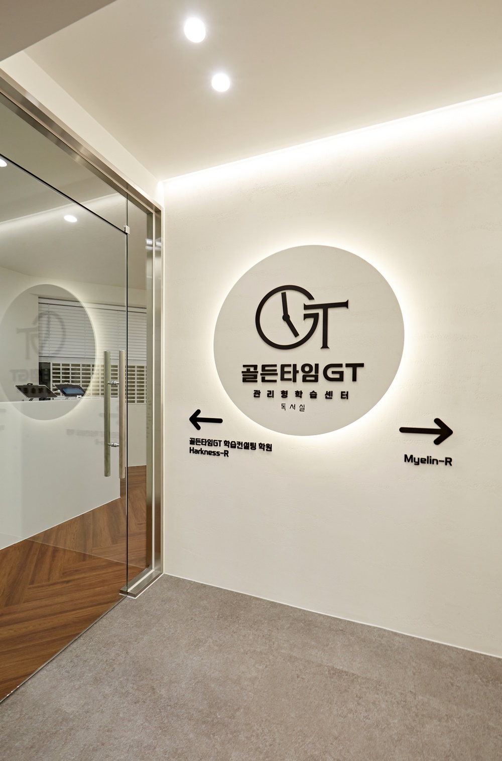 은은한 간접 조명이 로고 주위를 감싸며 방문객들에게 신뢰감과 전문성을 동시에 전달하죠.