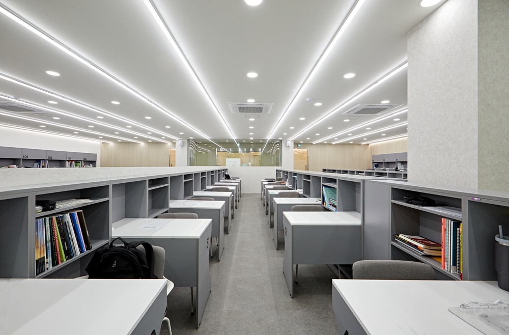 탁 트인 대형 테이블은 개방된 환경에서 공부하기를 선호하는 학습자들에게 최적의 장소이며 화이트 보드와 조명을 결합한 벽면은 그룹 스터디나 소규모 강의가 가능하도록 실용적으로 꾸며보았죠.