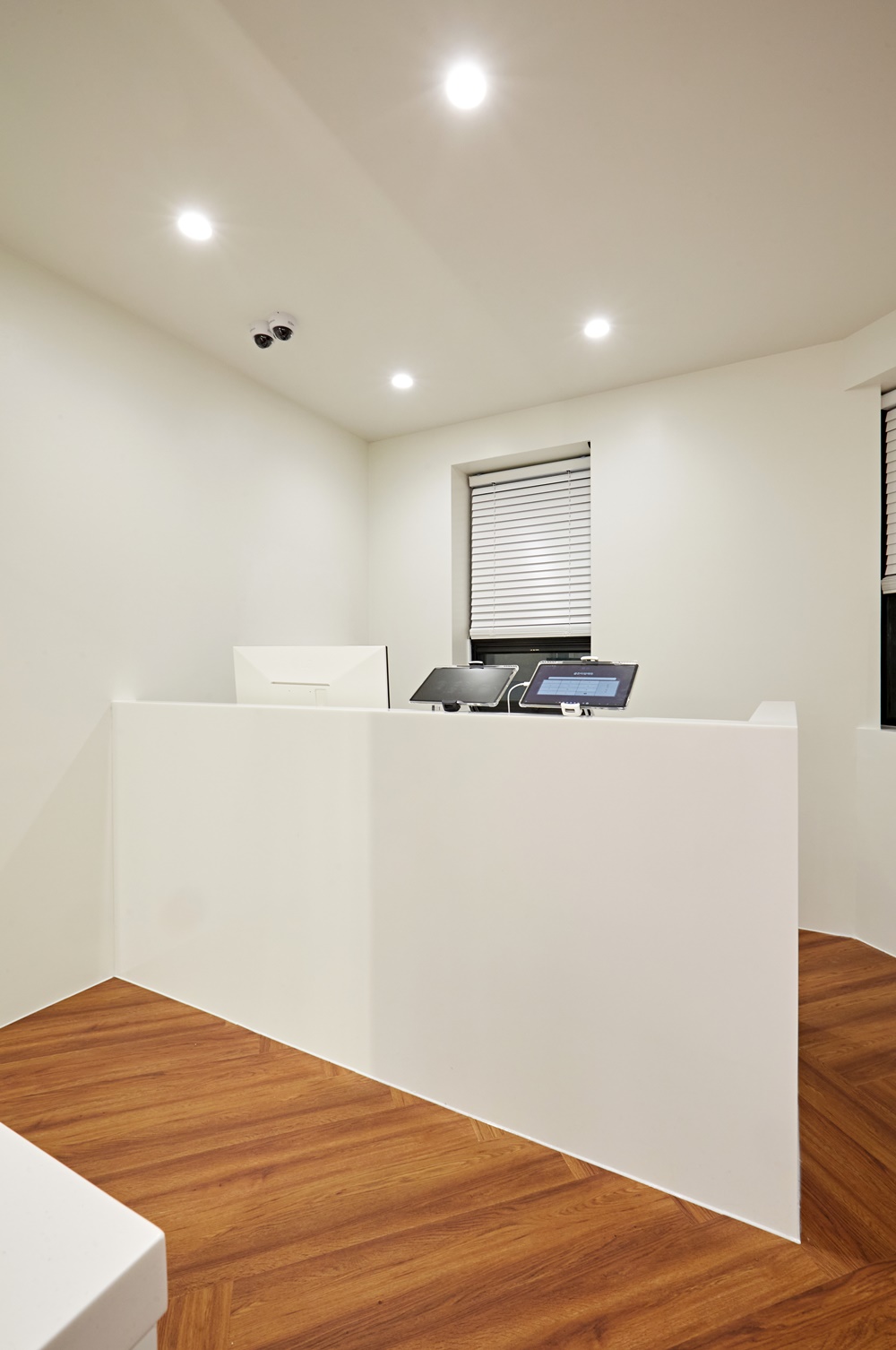입구에 들어서면 가장 먼저 시선을 사로잡는 것이 고급스러운 화이트 톤의 인포메이션 데스크와 벽면에 시공된 로고 디자인인데요.