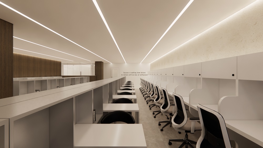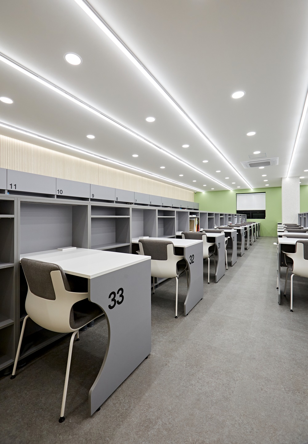 그레이 톤의 책상과 인체공학적 의자는 장기간 집중력을 유지하는 데 도움을 주며 상단에는 개별 수납장을 배치하여 개인 물품을 편리하게 보관할 수 있도록 했습니다.
