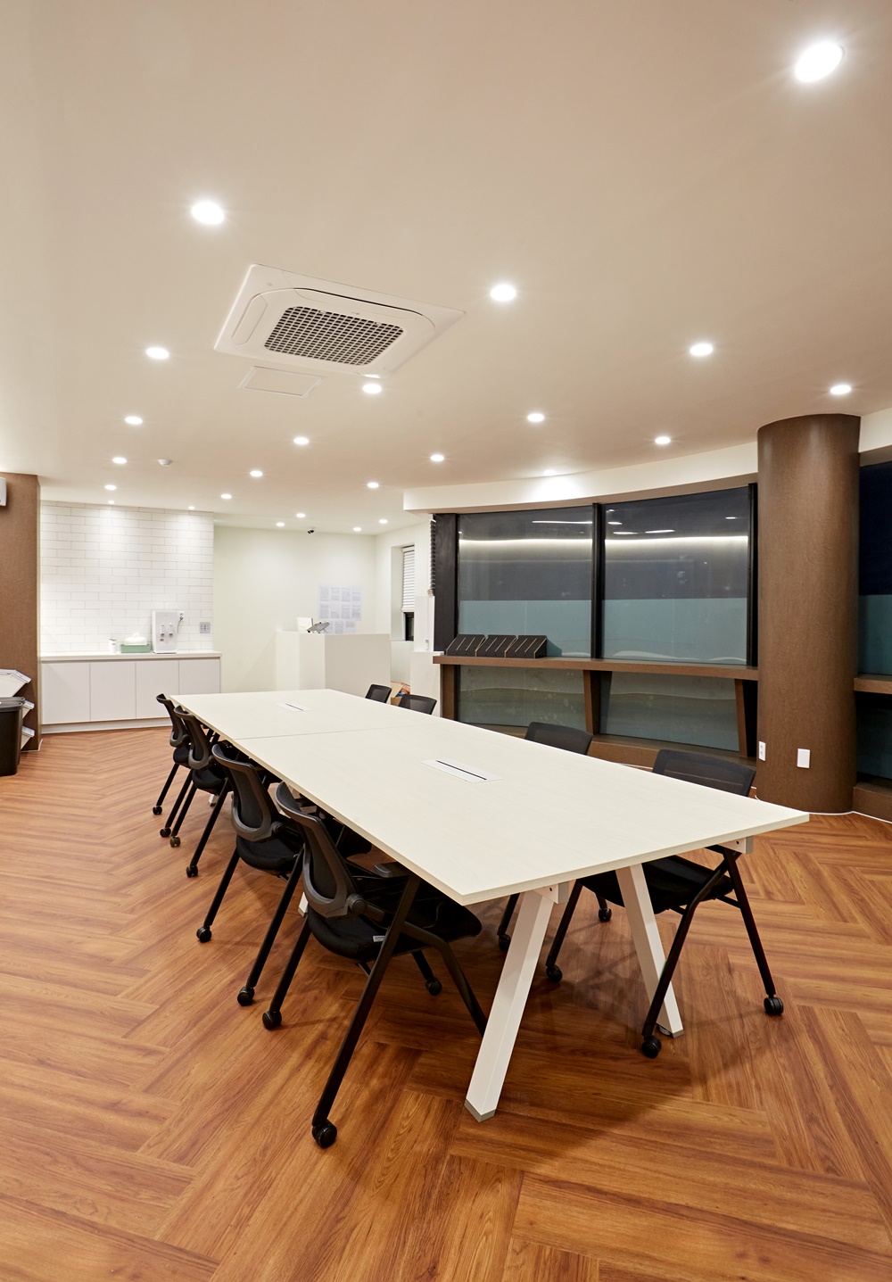 라운지 공간은 따뜻한 나무 질감의 헤링본 바닥재를 사용하여 카페형 라운지 특유의 안락함을 극대화했습니다.