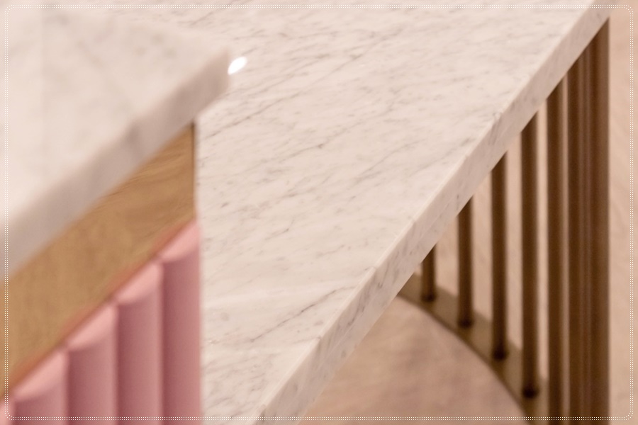 안내데스크의 모습입니다. 이전까지의 연한 핑크톤의 색 조화와는 다르게 이곳은 확실한 핑크라는 색을 이용해서 공간의 중요성을 강조해보았습니다. 요가원을 방문하는 고객들이 확실하게 안내를 받아서 올 수 있게끔 분위기를 살려 보았습니다.