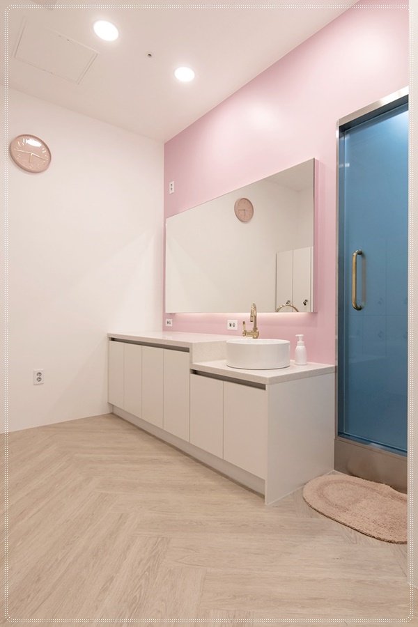 요가원의 수납 공간의 모습입니다. 캐비넷의 색깔을 전부 핑크톤과 같은 느낌으로 배치해서 공간을 사용하는 고객들이 편안한 느낌이 확실하게 들 수 있도록 도와주고 있으며 거울의 주변에는 캐비넷과는 달리 진한 핑크톤의 색감을 이용하여 공간의 분위기를 더욱 더 살려보았습니다.