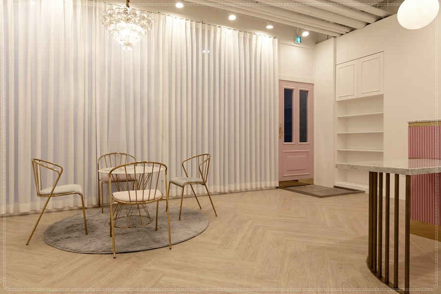 이러한 분위기 전환에 도움을 주는 것은 출입문이라고 할 수 있습니다. 이전까지의 운동 공간은 화이트톤의 색감만 사용이 되었음에도 불구하고 이를 조명을 이용해서 전환시키는데 많은 기여를 했었습니다. 그러나 핑크톤의 색감을 이용한 출입문은 요가원의 분위기 조성을 하는데 있어서 하나의 요점으로 작용을 하였습니다.