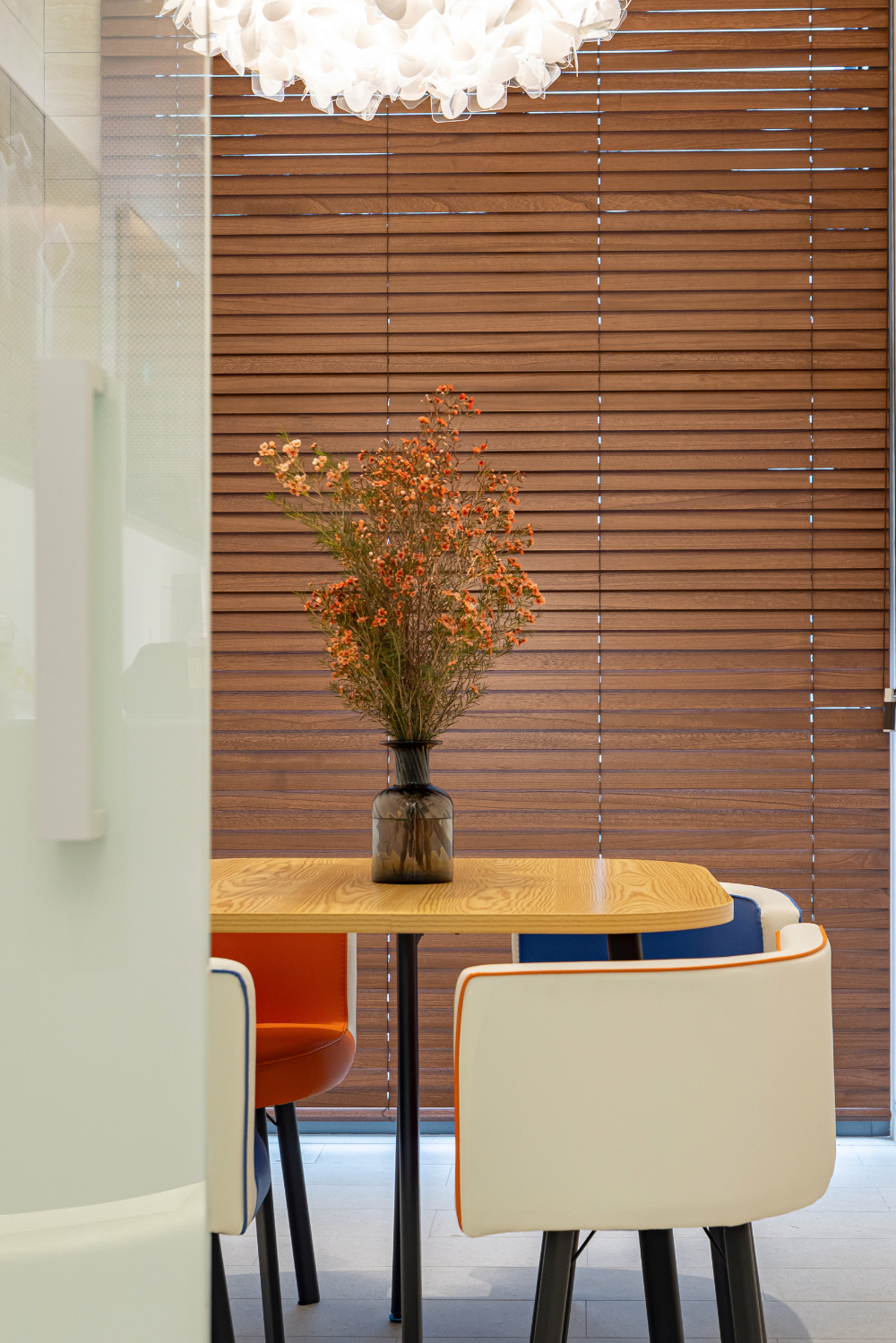 그리고 직원이 많은만큼, 별도의 카페테리아 공간은 간단한 취사도 가능하도록 쿡탑을 매립하였는데요. 그리고 편안하게 식사할 수 있는 테이블과 수도 등이 전부 마련되어서 마치 가정집의 다이닝룸을 연상시킵니다. 마찬가지로 블라인드는 우드소재로 통일하였으며, 테이블위에 놓인 화분 하나만으로도 분위기를 화사하게 바꾸는데요. 조금 더 프라이빗한 공간을 위해 글라스월 하단에는 불투명 시트지를 부착했습니다.