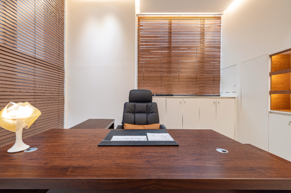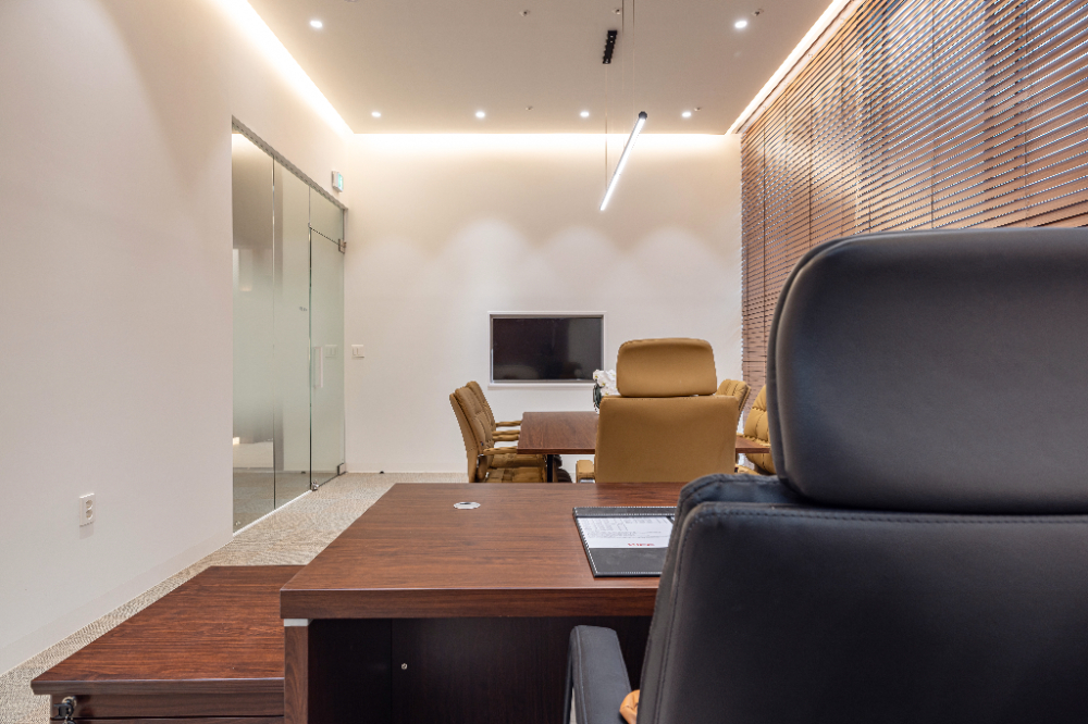 대표님이 머무르시는 CEO룸부터 찬찬히 살펴보겠습니다. 동대문구 청량리 지식산업센터인테리어는 앞서 말씀드린대로 우드인테리어를 기반으로 했습니다. 그래서 블라인드 소재도 우드로 활용하였으며, CEO 테이블과 별도로 회의를 할 수 있는 테이블도 배치하였는데요.