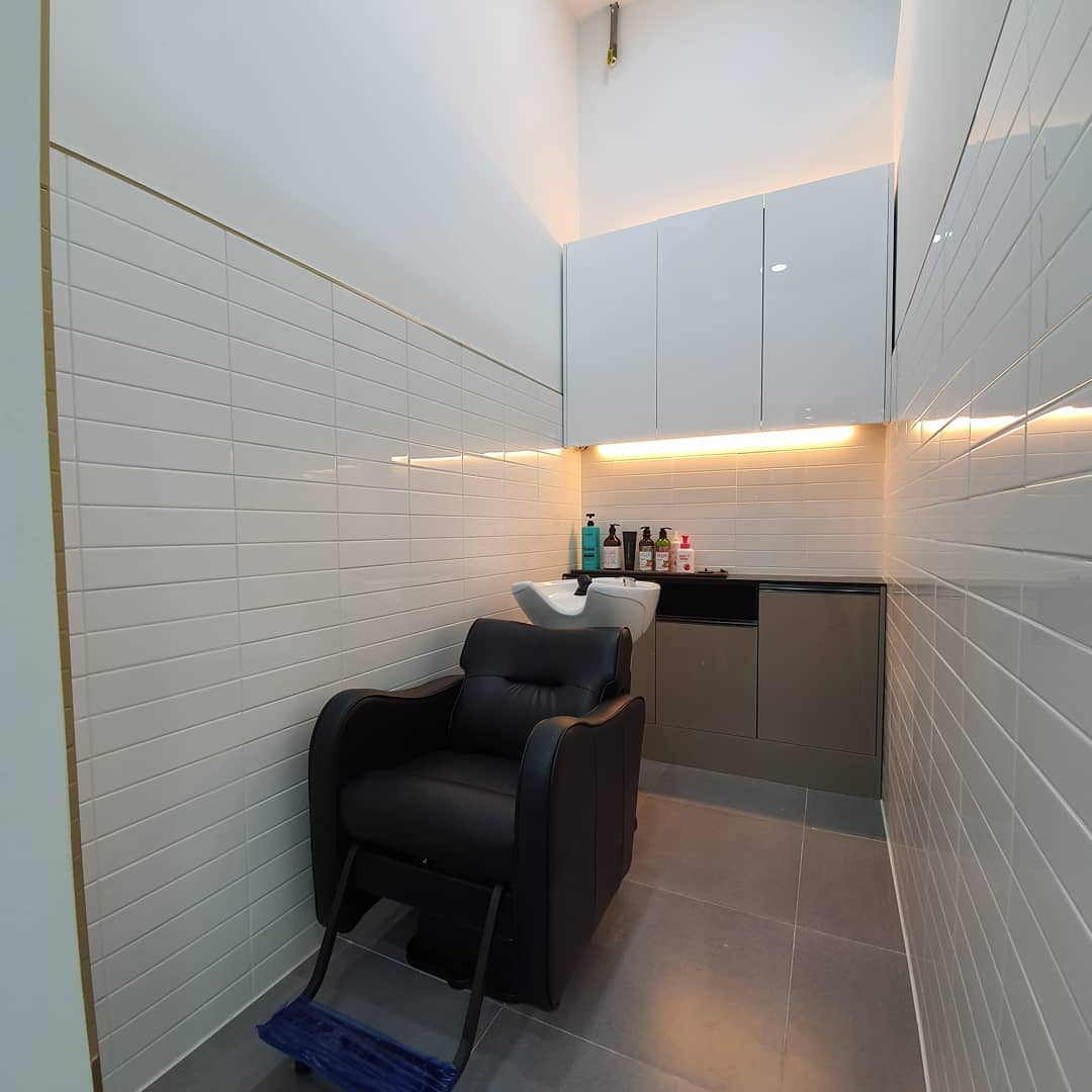물을 쓰는 샴푸 공간에는 그에 맞는 벽면 타일을 적용하고 배수, 배관을 시공해야 하므로 미용실인테리어를 할 때는 반드시 전문 시공회사와 상담을 하고 의뢰하는 것이 바람직 합니다. 수건, 샹품, 약품 등을 수납할 수 있는 상부 하부 수납장도 샴푸 공간으로 넣어 머리를 하는 공간을 좀 더 넓게 사용하실 수 있도록 시공해 드렸습니다.