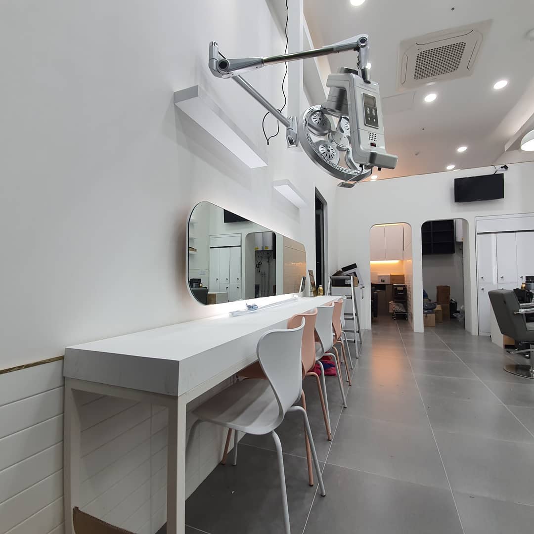 반대편 벽면에는 테이블과 의자를 배치하고 거울을 설치했고 벽면 상단에 미용 기계를 설치해 이용성과 편리성을 높였습니다. 미용기계를 천장이나 벽면에 설치를 하면 공간을 좀 더 넓게 사용할 수 있고 다니는 동선을 방해하지도 않아 공간을 효율적으로 활용할 수 있습니다.