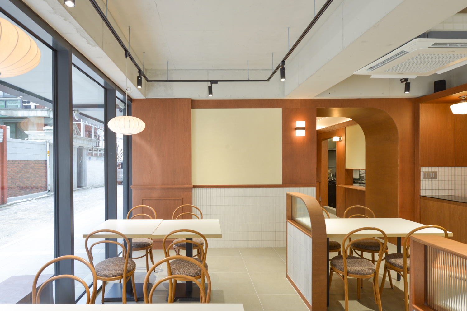 벽면 하단에는 화이트 타일로 설치했고, 가벽이나 가림막은 최근 유행하는 반 아치형 라인을 사용 했습니다.아치형 라인은 디자인 자체만으로도 부드러운 이미지를 줄 수 있는데 여기에 우드까지 더해지니 그 효과를 배로 만들어준 것 같습니다.