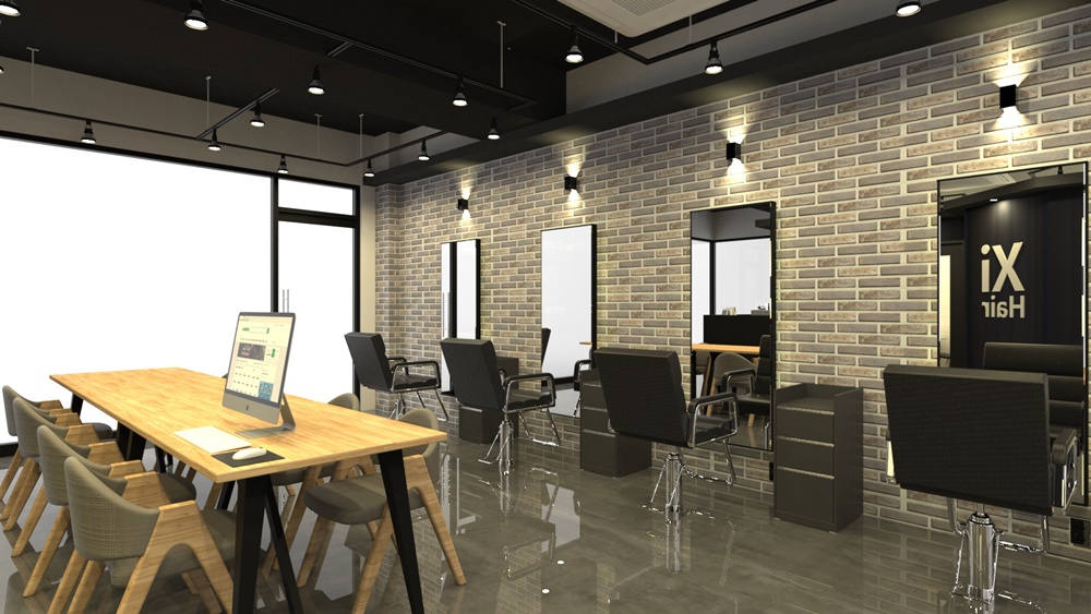 미용실 매장 인테리어 전체 도면을 보셨다면 지금부터는 동작 서초 역삼 미용실인테리어, 고급스러운 3D 디자인 설계 시안 현장의 세부적인 디자인 및 설계를 보여드리도록 하겠습니다. 가장 먼저 시술공간과 함께 고객이 대기할 수 있는 공간이 마련된 매장 전체 모습을 확인해 보실 수 있습니다. 벽돌 디자인의 타일을 벽면에 넣어 빈티지한 느낌을 표현하였으며 거기에 모던한 벽등을 더하여 세련된 분위기를 높여 드렸습니다.