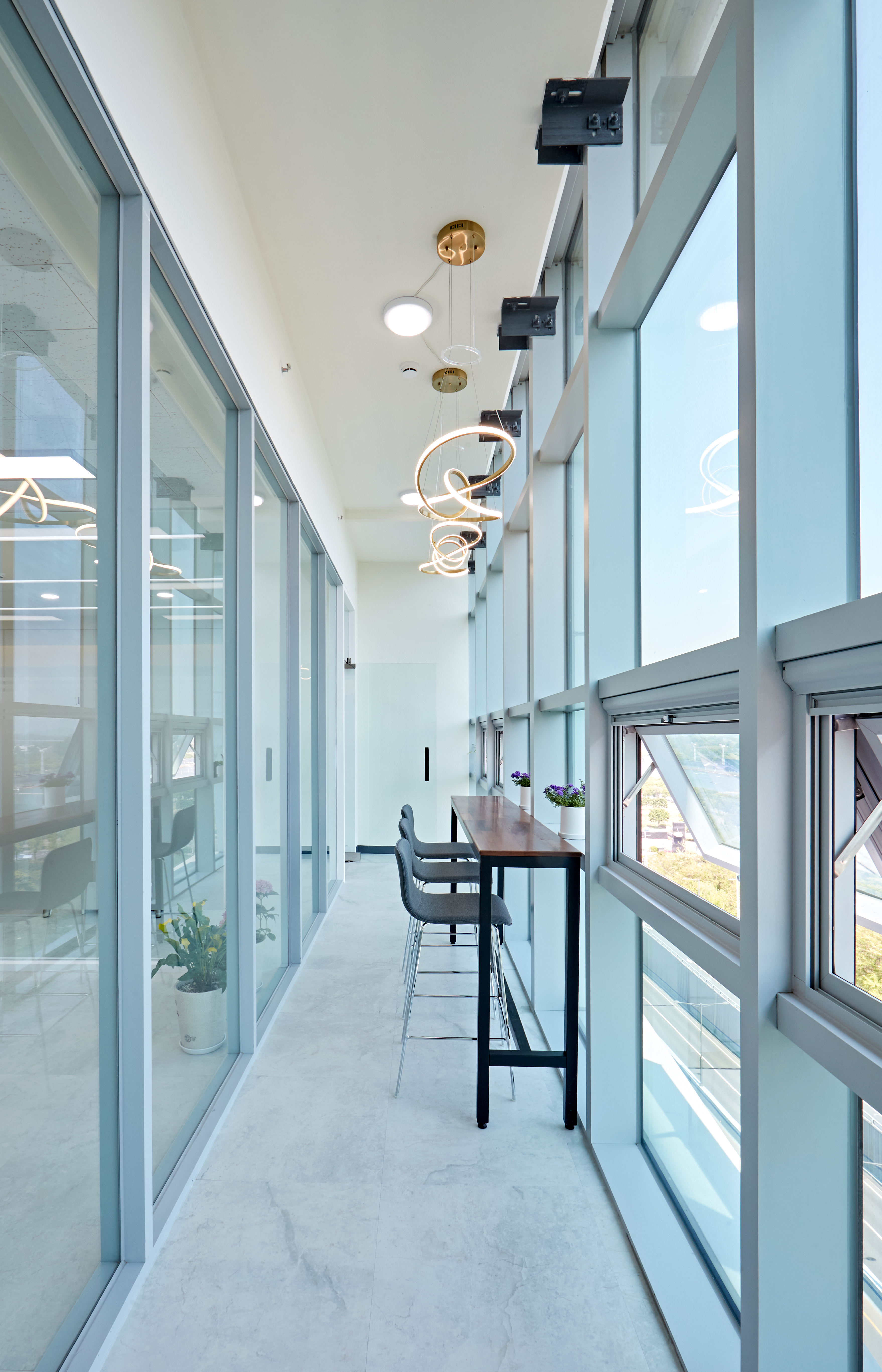 긴 테이블과 의자를 창가에 배치하여 휴식 공간을 갖춘