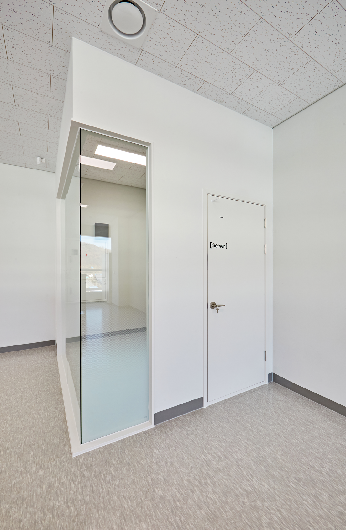 천장에는 규칙적으로 배치된 라인 조명을 설치하여 균일하고 밝은 조도를 확보하였으며, 창가를 따라 크게 배치된 통유리창은