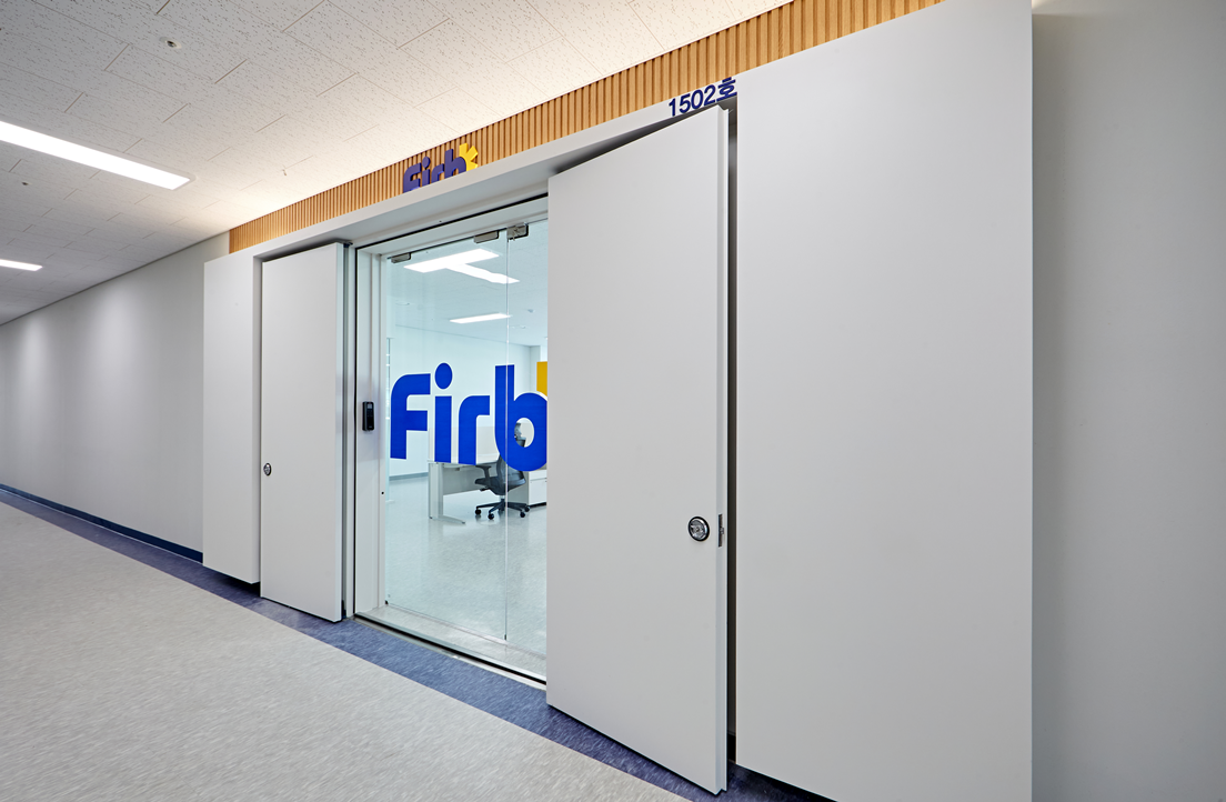 화이트톤의 심플한 벽면 디자인을 적용하고, 상단에 우드 포인트를 주어 단조로움을 피하고 자연스러운 온기를 불어넣어 주었습니다. 또한 기업 사인물을 부착하여 기업의 아이덴티티를 명확하게 전달하였죠.