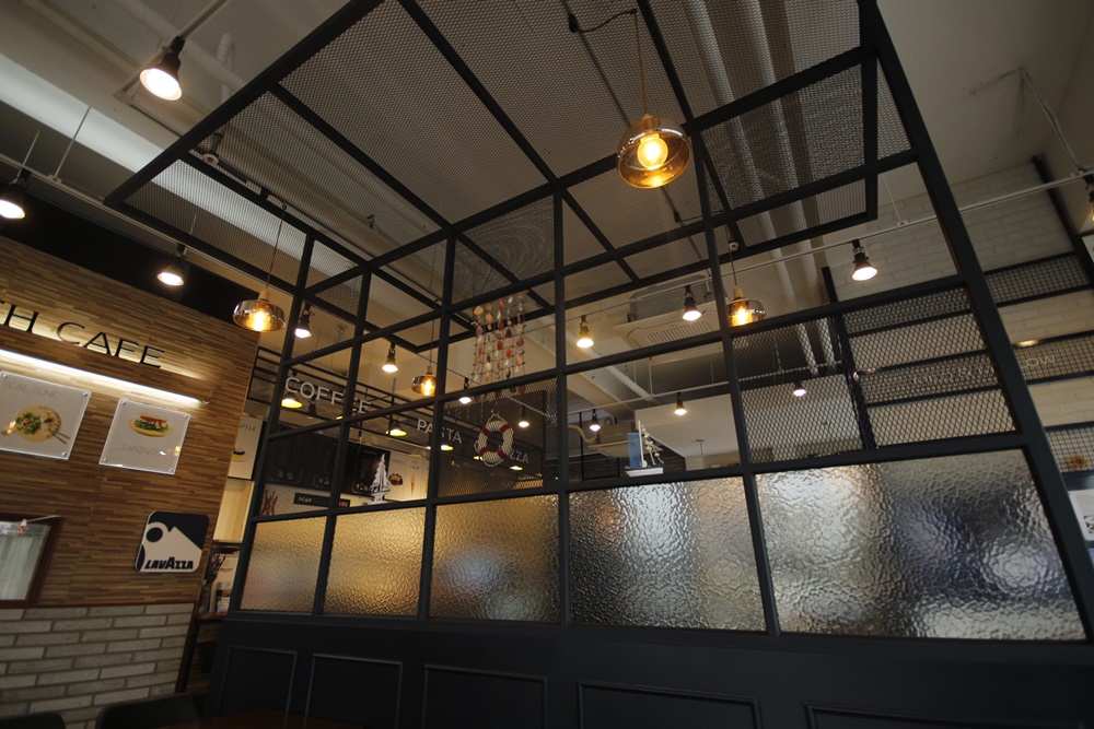 투명 유리 파티션을 도입해서 카페 내부 공간을 기능별로 자연스럽게 구분하면서도 시각적 개방감은 최대한 살렸어요.