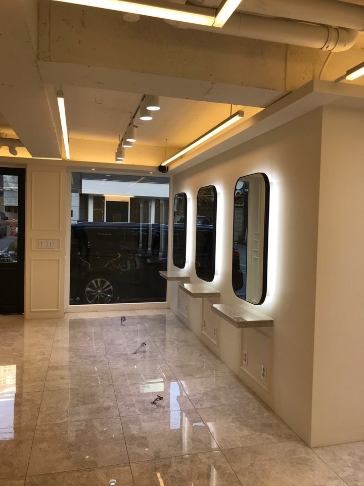 경대 공간에는 둥근 스퀘어형의 거울을 붙이고 뒤편에는 간접조명을 더해 시술 받는 분의 얼굴이 더욱 예뻐 보일 수 있도록 했고 경대 공간 바로 위 천장에 레일형 조명을 시공해 스타일을 정확히 보고 판단할 수 있도록 조명을 더했습니다. 천장의 레일형 조명은 인테리어적으로 트렌디한 분위기를 조성하고 각도와 위치를 바꿀 수 있기 때문에 차후 인테리어에 변화가 생기더라도 충분히 활용할 수 있습니다.