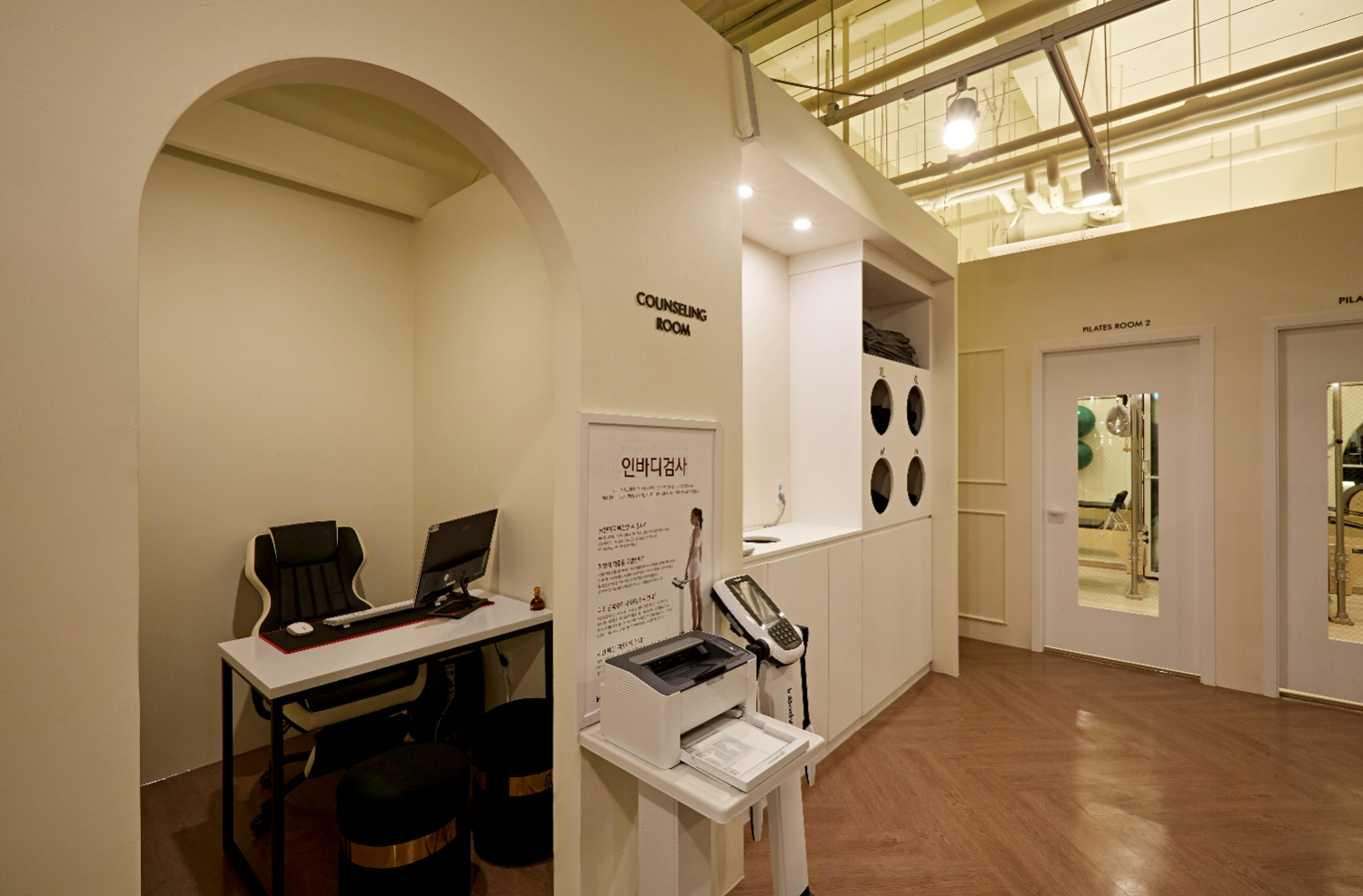 카운터의 뒷편에는 동탄 기흥 여주 헬스장인테리어에서 빼놓을 수 없는 컨설팅룸이 있었습니다. 고객의 현재 상태를 체크해주는 인바디 기계와 아치형으로 되어 있는 룸으로 들어가면, 프라이빗한 상담실이 마련되어 있고요. 옆에는 고객들이 편하게 운동복을 가져가실 수 있도록 사이즈별로 원형 타공 수납함을 만들었습니다. 그리고 바로 반납할 수 있도록하여 동선을 최소화하여 효율적인 면을 강조하였습니다.