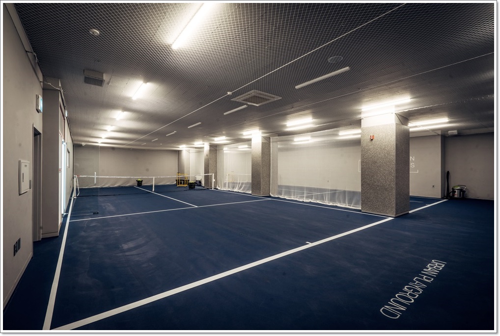 실내 운동시설 테니스장의 내부 전경입니다. 전체적으로 어두운 톤의 색감을 사용하였지만 이를 조명을 이용해서 밝은 실내 분위기를 형성해보았습니다. 이와 같은 인테리어는 테니스장을 이용하는 고객들이 조금더 운동에 집중을 하면서 실내 시설을 이용할 수 있도록 하였습니다. 바닥 같은 경우에도 운동을 하시는 고객들이 다치지 않도록 부드러운 소재를 이용해서 구성해보았습니다.