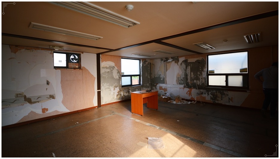 철거한 현장에서 아이들의 수업이 주로 이뤄질 공간 위의 천장에는 조명을 설치할 프레임을 먼저 시공해 자리를 잡았습니다. 전체 조명으로 활용될 예정이기 때문에 기다란 직선형 조명과 레일 조명을 복합적으로 구성해 충분한 조도를 확보할 수 있도록 했습니다.