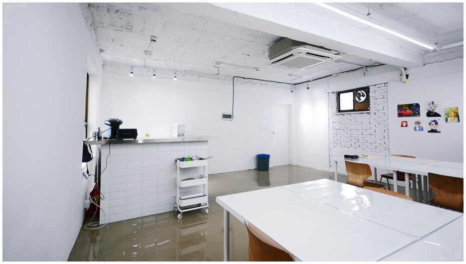 가벽을 세우지 않으면 비용을 최대한 줄일 수 있다는 장점도 있죠. 그래서 예산이 적은 동탄 수원 영통 15평 20평 미술학원인테리어는 916디자인과 같은 전문에 맡겨야 하는 이유!랍니다. 가벽을 세우지 않고 전체를 화이트로 마감하면 좀 더 넓어 보이면서 조명이 반사되어 화사해 쾌적한 공간이 될 수 있는데요, 대신 바닥은 좀 더 진한 그레이를 적용해 디자인 밸런스를 맞췄습니다.