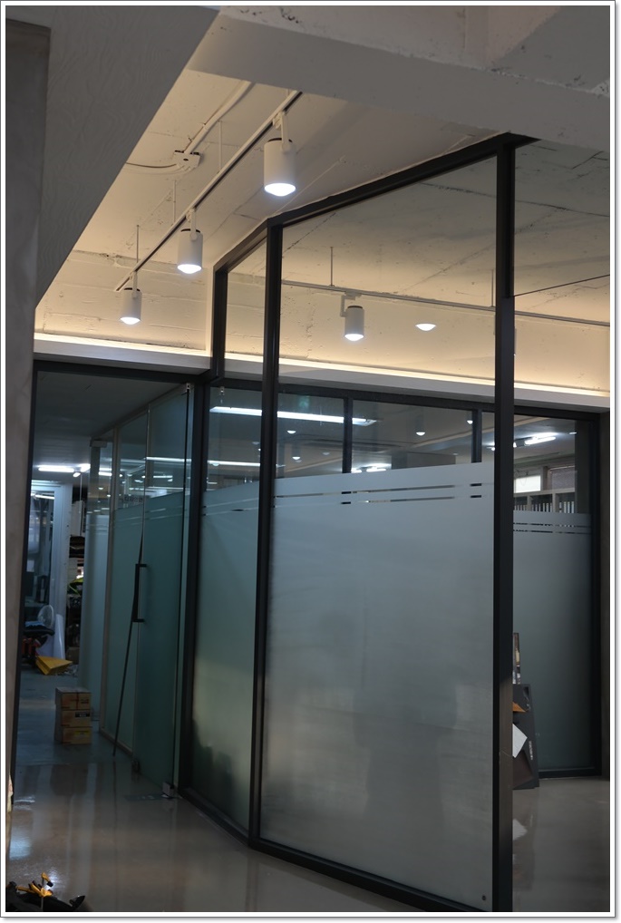 고객님의 니즈를 적극 반영해 전체적으로 답답해 보이지 않으면서 창으로 들어오는 자연광을 공유할 수 있도록 유리 가벽을 적용했고 대신, 개별 사무공간은 불투명 시트지를 시공해 프라이버시를 확보했습니다.
