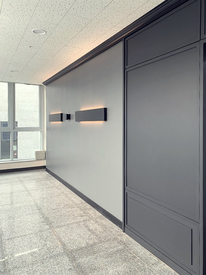 앞서 보신 회사 사무실 외부 벽면 옆쪽에는 깔끔한 블랙 컬러 라인에 간접조명을 더하여 포인트를 주었습니다. 그리고 작은 배너를 더하여 세련된 분위기를 높였습니다. 외부 인테리어 천장 부분에 따스한 간접조명을 더하여 화사한 분위기를 표현한 부분도 확인해 보실 수 있습니다.