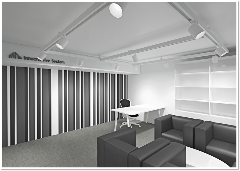 대표실은 기업의 색이 가장 짙고 대표의 색을 보여주는 인테리어가 되어야만 합니다. 외벽은 화이트톤을 이용하여 사무실의 전체적인 회사 인테리와의 통일성을 유지를 하였지만 벽의 한면을 무채색을 이용한 다양한 줄무늬로 구성을 하여서 대표의 인상이 조금 더 강렬할 수 있도록 외벽 스타일링을 하였으며 난잡해보일 수 있는 벽의 윗부분에는 기업의 로고를 넣어서 통일성을 강조하였습니다. 대표실 인테리어는 검정색의 낮은 소파를 배치해서 무게감을 더하였습니다.
