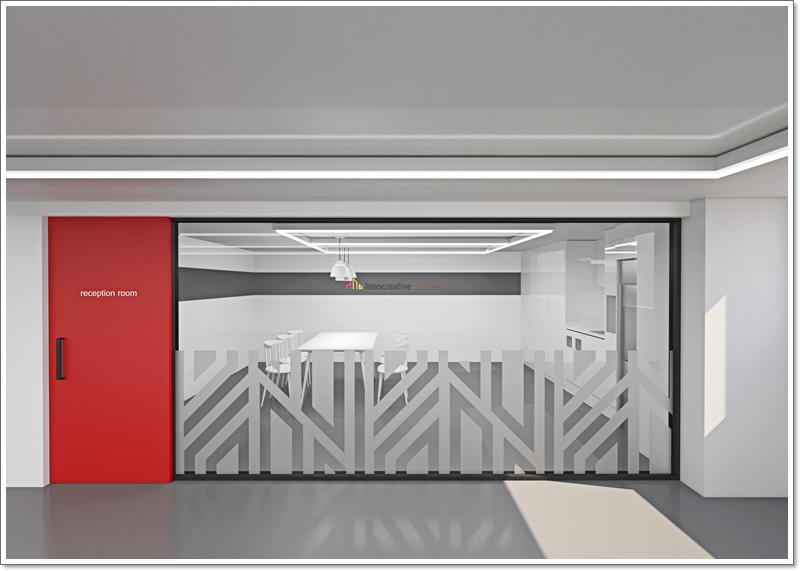 접견실의 외벽 또한 바깥과 이어지는 벽을 유리문으로 구성을 하였고 너무 투명하지 않게 기하학적인 스티커를 부착하여서 고객이 상담을 받을 때 너무 부담스럽지 않도록 구성을 하였습니다. 또한 문의 색깔은 강렬하다고 할 수 있는 빨간색으로 포인트를 주어서 시선을 분산시켜주는 효과를 주기도 하였습니다.