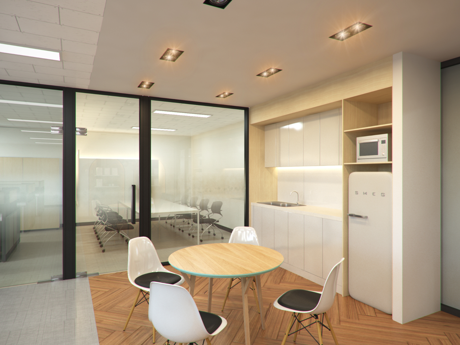 안쪽의 카페테리아 공간과 사무 공간은 대비되는 느낌을 확실히 주기 위해서 다양한 변화점을 주었습니다. 바닥의 소재도 다르거니와 천장의 조명의 온도까지 다르게 한 점인데요. 사무공간은 차갑고 화이트의 느낌이 강하다면 카페테리아쪽은 따스하면서도 조도를 높여 아늑한 느낌을 강조하였습니다.