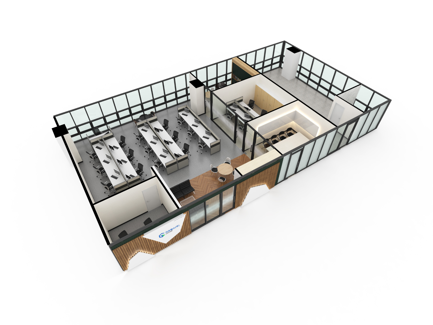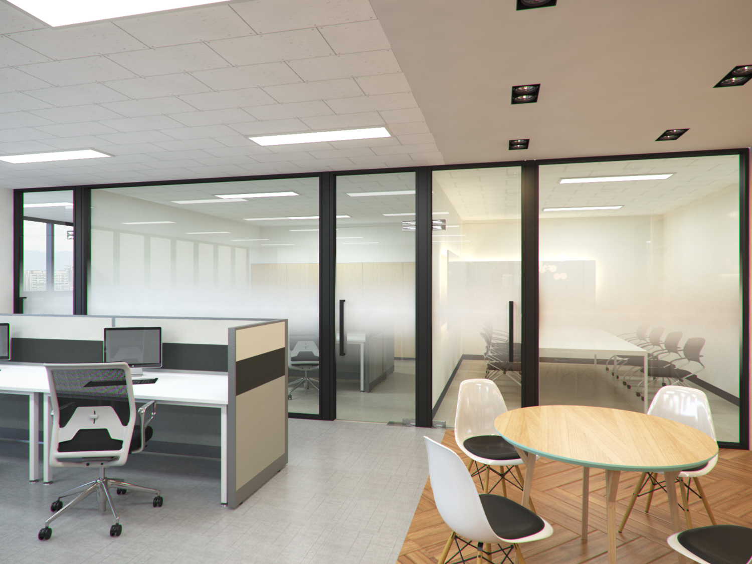 개별 룸으로 되어있는 곳은 적당한 크기와 전체 사무 공간과의 통일성을 고려하여 비슷한 소재로 이뤄져있습니다. 천장은 연결되어 동일한 스타일로 시공이 되어있으며 내부 벽은 아이보리톤의 따뜻한 화이트로 그리고 바닥은 그레이 색상이며 프레임과 비슷한 결을 주기 위해 걸레받이 및 몰딩은 블랙으로 제작되었습니다.