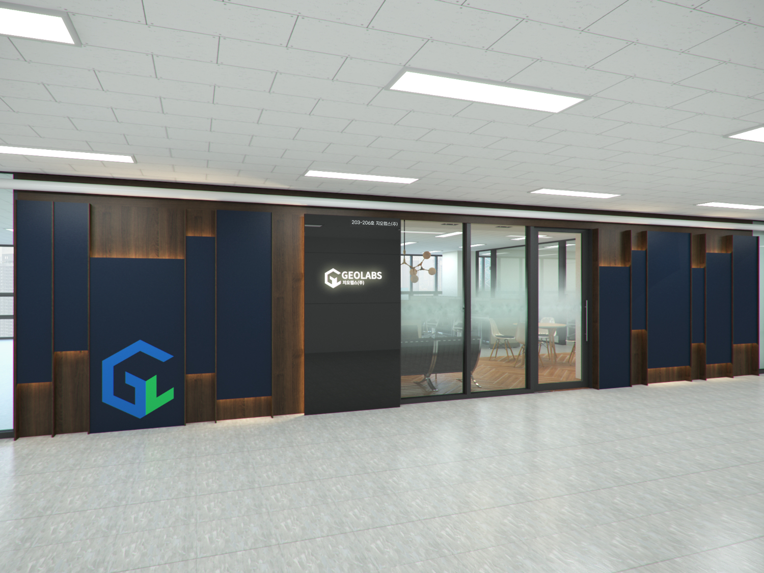 마곡 김포 오피스인테리어의 입구 파사드부터 시작하여 둘러보도록 하겠습니다. 복도식으로 되어있는 건물을 지나면 오늘의 주인공인 지오랩스 사무실을 만나볼 수 있습니다. 외벽은 조금 특이한 목재 파사드로 포인트를 주었는데요. 네이비컬러의 사각 블록이 불규칙적으로 양각처리 되어 있으며 후면에는 조명이 부착되어 있습니다.