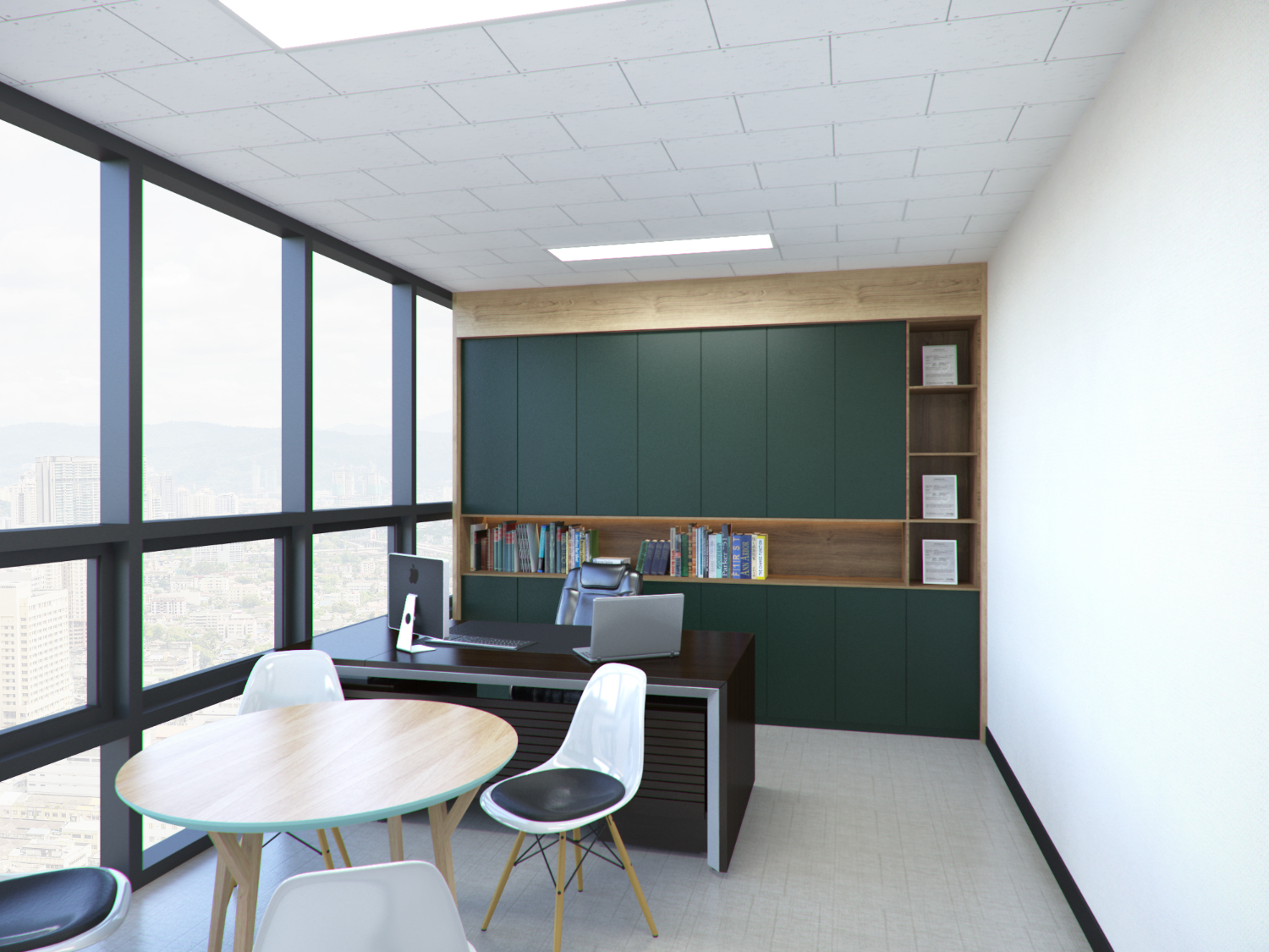 대표실에는 더욱 많은 자료들을 수납하고 전시할 수 있도록 다크 그린 색상의 수납 공간을 만들었는데요. 상부장을 길게 만들면서도 천장 윗 부분의 여유를 두어 개방성을 높였습니다. 그리고 조명을 매립하는 것을 잊지 않았는데요. 916디자인에서는 나중에 가구가 들어오고 배치되었을 때 까지를 고려하여서 공간의 넓이와 분위기를 만들어내기 때문에 인테리어하시기에 더할나위 없이 좋으시리라 생각합니다.