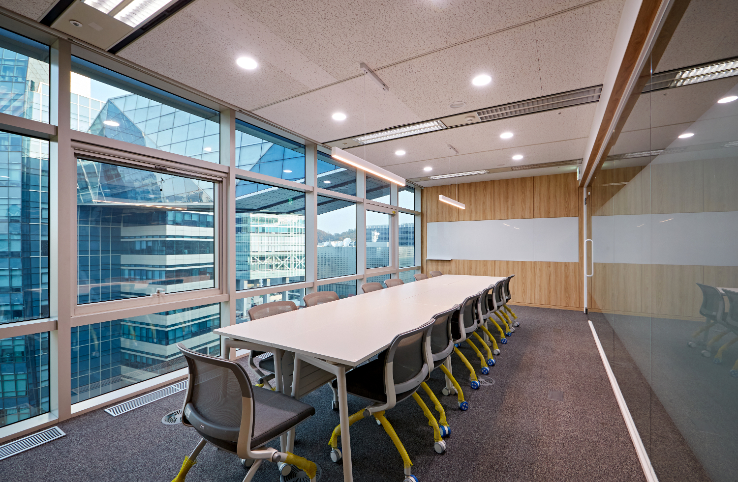 소형 미팅룸의 경우 4인석의 테이블이 위치하고 있는데요. 외부와는 조금 다른 분위기 연출을 위해서 우드 소재로 벽을 장식하였으며 중앙에 화이트보드를 매립하였습니다. 요즘은 이렇게 처음부터 회의실에 보드를 매립하여 효율적인 근무 환경 구축을 위해 힘쓰는데요.