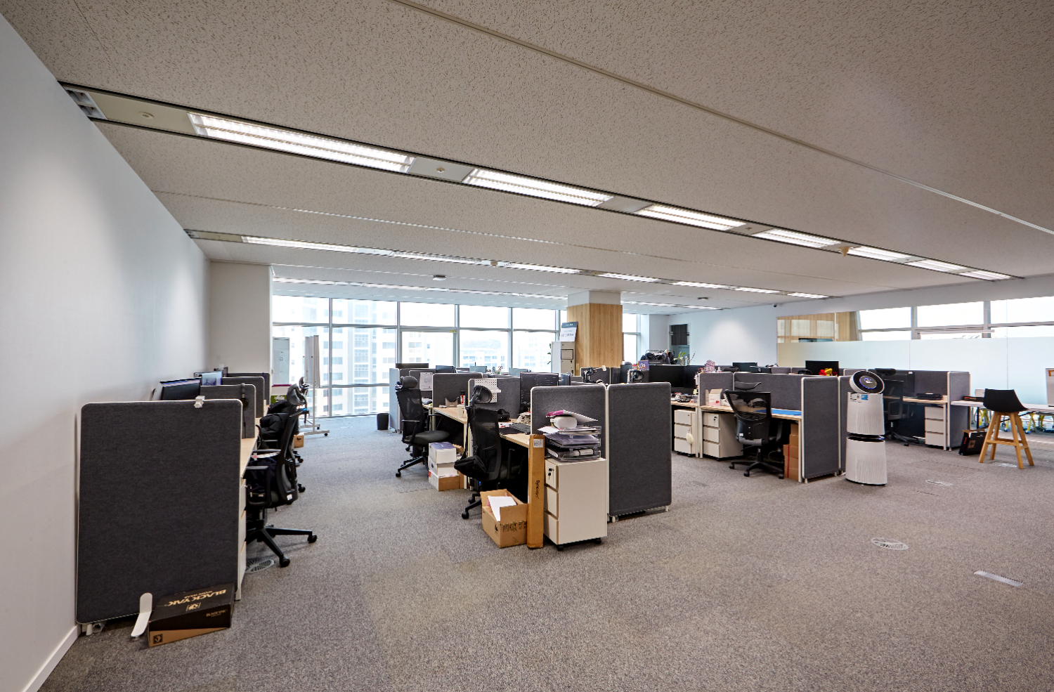 마지막으로 마포구 상암동 140평 대형 사무실인테리어의 직원분들이 상시 머무르는 공간인 업무 공간은 바닥의 색상과 톤이 어울리는 다크그레이 컬러의 파티션으로 구역을 나누었습니다. 업무를 할 때에는 각자만의 시간에 집중할 수 있는 환경이 만들어져야 하는데요.