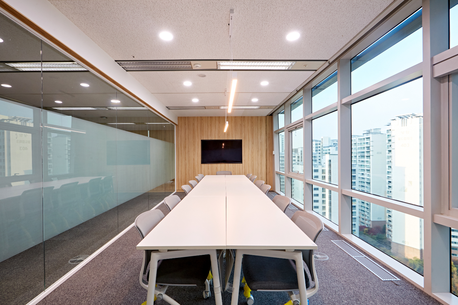 대형 미팅을 진행하는 대회의실입니다. 마포구 상암동 140평 대형 사무실인테리어에서는 유리 파티션 중앙에는 필름지를 시공하여 최소한의 프라이빗함을 지켜내면서도 답답하지 않도록 도와드렸고, 중앙에는 팬던트 조명을 설치하여 시야를 더욱 밝혔습니다.