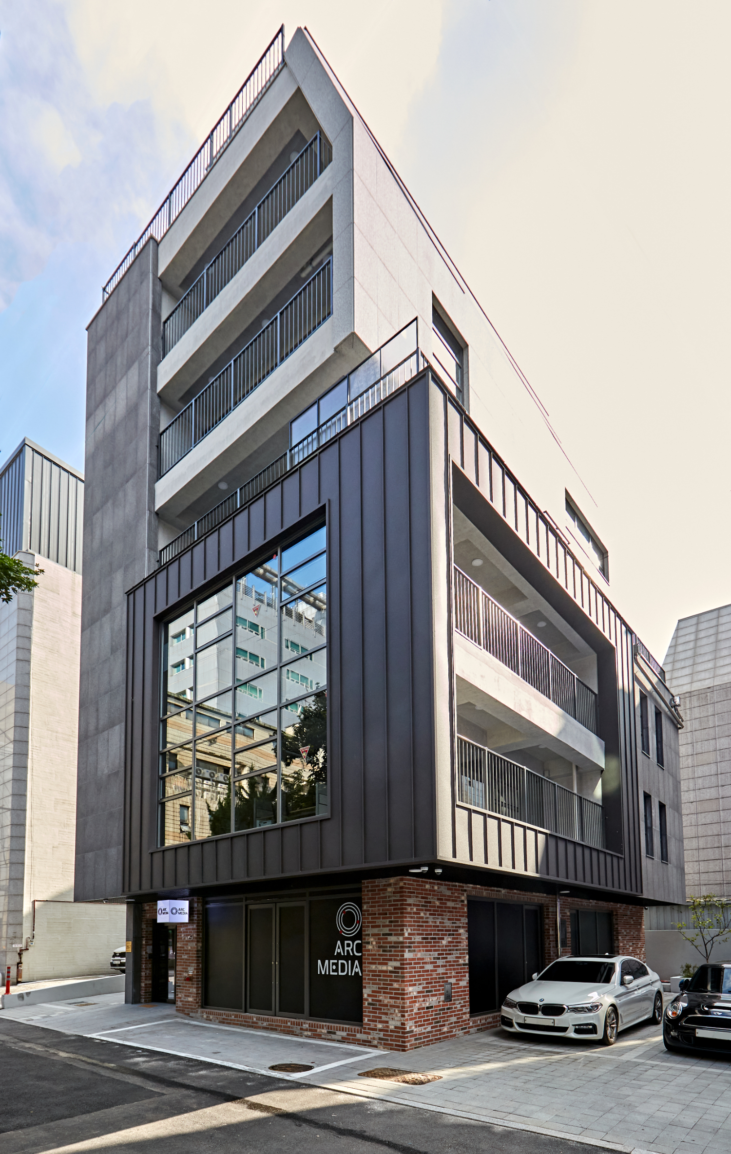 지하층 입구는 블랙과 그레이의 모노톤 컬러로 처리 했습니다. 벽면은 라이트 그레이, 바닥은 다크그레이 컬러의 타일로 무게감을 맞춰주었고, 출입문은 투명 도어로 개방감 있게 마무리 해주었습니다.