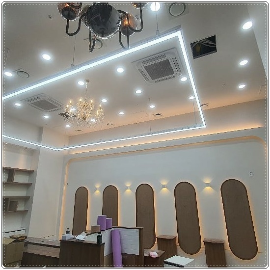 이 미용실은 전체적으로 천장의 테두리를 따라 라인 조명을 시공했고 벽면을 따라 간접 조명을 설치했으며 중앙에는 상들리에 조명을 달아 오픈천장과 조명이 매력포인드인 고급스러운 분위기를 연출하도록 시공해드렸습니다.