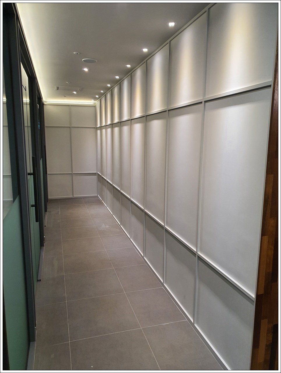 상담실에서 문을 열고 나오는 복도 벽은 화이트로 마감해 막혀있지만 넓어보이는 효과를 부여했습니다. 화이트 벽면은 그레이 도장이나 원목의 벽면보다는 공간을 확장해보이고 조명이 반사되면 좀 더 화사한 느낌이 들게 할 수 있어 기분이 편안해지고 아늑해지는 느낌을 받을 수 있습니다.