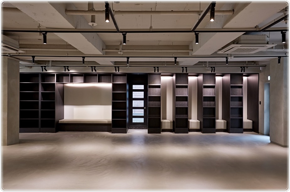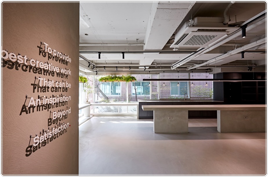 1층 라운지 공간입니다. 들어가는 입구에 아트월을 시공하고 금속 스펠링 사인물을 입체적으로 연출했습니다. 노출천장으로 시공해 층고를 확보했고 콘크리트 색감으로 마감해 인더스트리얼 컨셉으로 꾸몄고 천장에 레일조명을 시공했습니다.