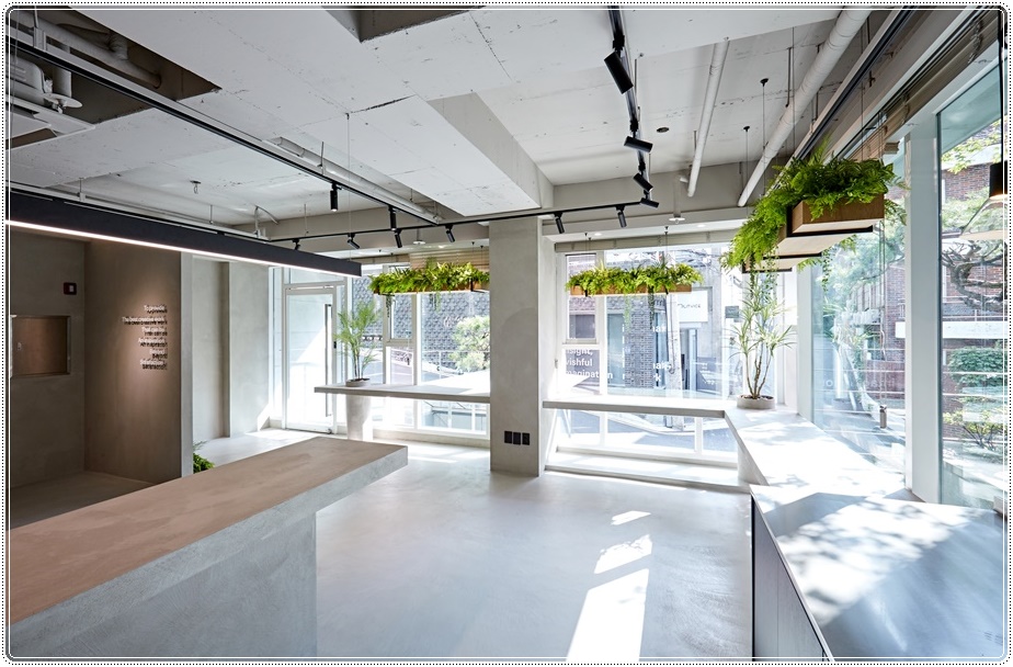 콘크리트 느낌의 인더스트리얼 컨셉트로 인테리어하고 플랜테리어와 자연채광을 활용해 네추럴한 연출을 시도한 라운지 모습입니다.