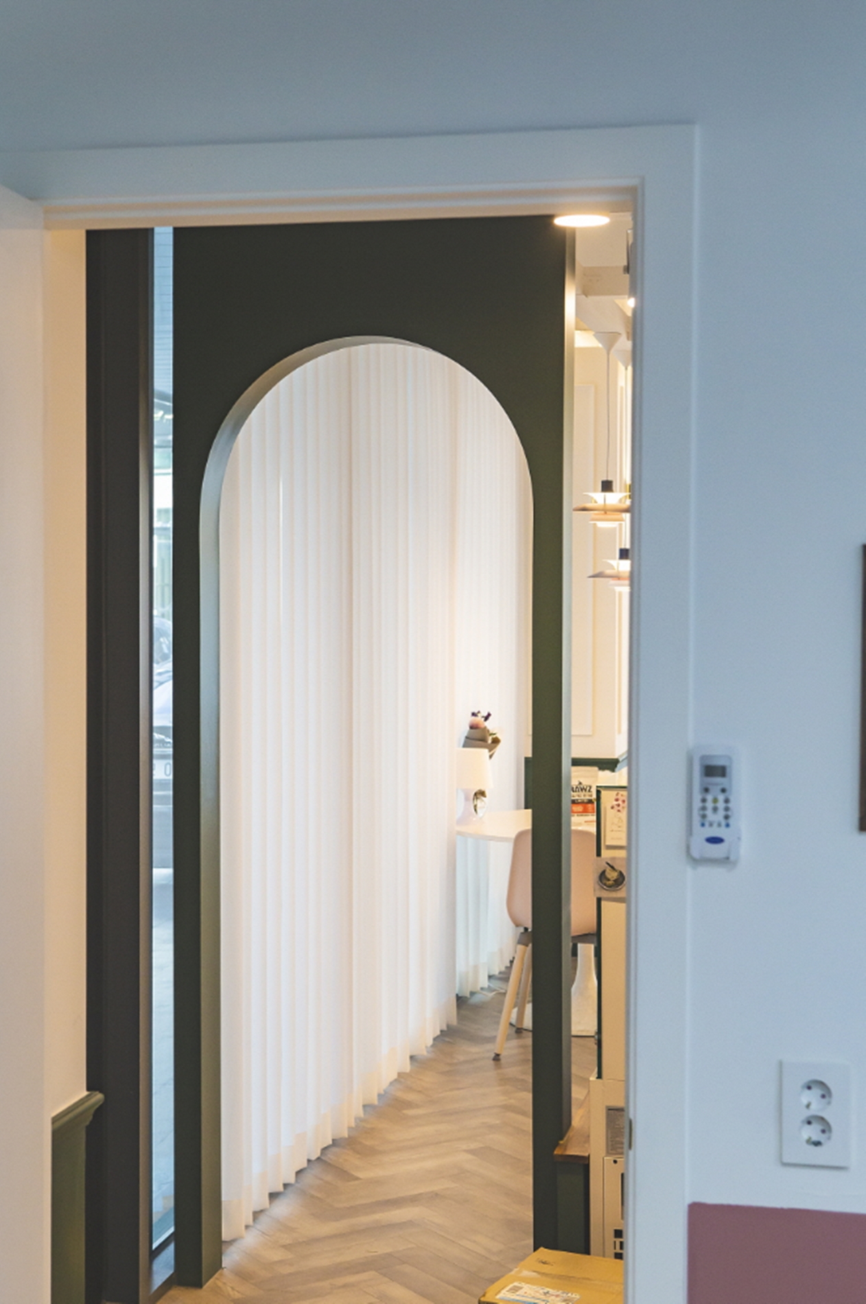 천장에서 내려오는 조명도 일반적인 팬던트가 아닙니다. 뷰티샵이나 살롱에서 적용하는 패턴인데요 이번 현장은 특별히 한번 설치를 해보았습니다. 마감을 하고 나니 넘 이뻐요