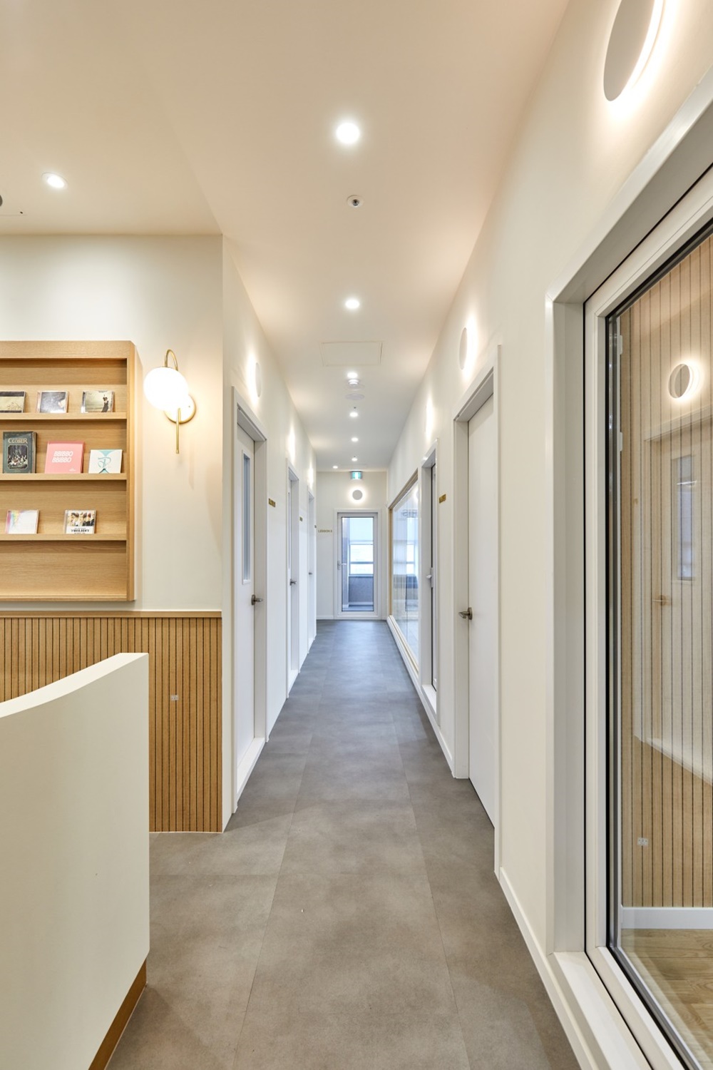 복도를 따라 배치된 각 레슨실 도어 역시 화이트 프레임에 세로형 유리창을 넣어 답답함을 해소했고, 문 위쪽에는 은은한 원형 벽등을 설치해 아늑한 분위기를 더했는데요.