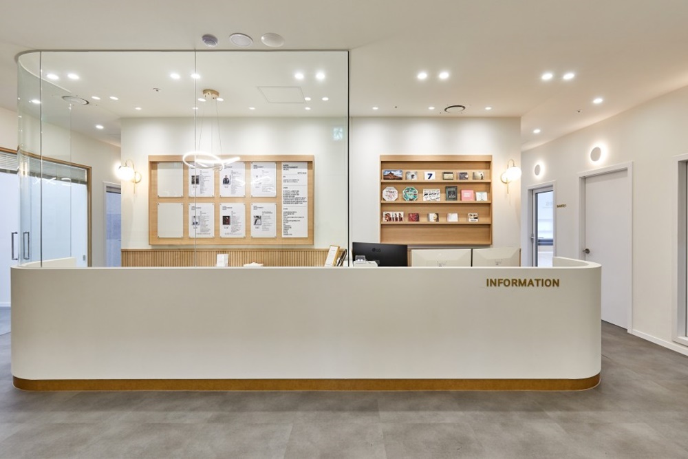 입구에 들어서자마자 마주하는 인포메이션 데스크는 화이트 컬러의 깔끔함과 하단부 우드 템바보드의 따뜻함이 만나 최상의 조화를 보여준답니다.
