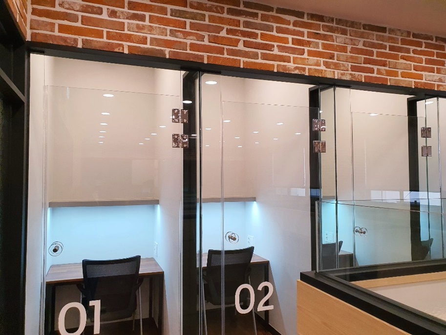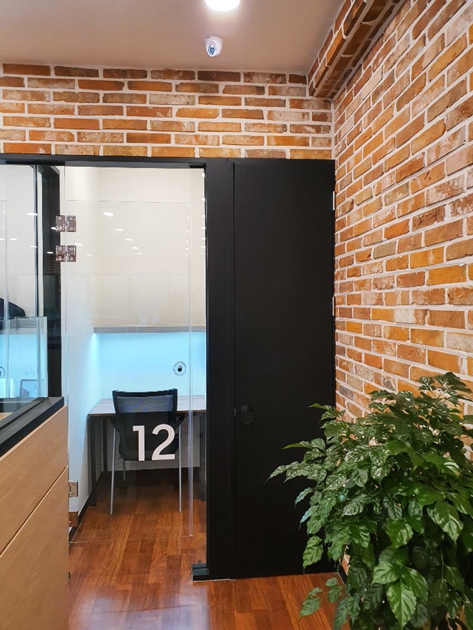 집중스터디실로 들어가는 입구입니다. 불투명 유리를 적용해 답답함은 해소하면서 외부 시선을 차단해 집중력을 높일 수 있도록 했습니다. 내부 벽면은 벽돌과 바닥은 우드를 적용해 카페테리아 공간과 완벽하게 구분되게 했습니다. 특히, 매립형 조명을 적용한 깔끔한 덱스 천장, 높은 파티션, 유리 칸막이 덧댐, 개별 스터디룸, 넓은 책상 등을 적용해 공부에 완전히 집중할 수 있는 환경을 조성했습니다.