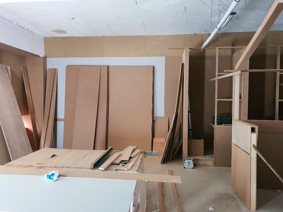 공사 전 현장을 둘러보니 공간의 가운데에 원통 기둥이 있고 천장은 덱스가 시공돼있어 모두 철거를 한 후 본격적인 공사를 진행하기로 했습니다. 이번 현장의 원통기둥은 철거가 가능했지만 만약 공간을 지탱하는 내력기둥이라면 철거가 불가능하기 때문에 그에 맞는 디자인설계를 적용해야 한답니다. 천장을 철거하고 배선, 공조, 소방시설, 전기 등의 설비를 설계에 맞게 정리한 후 목공 작업을 진행했습니다.