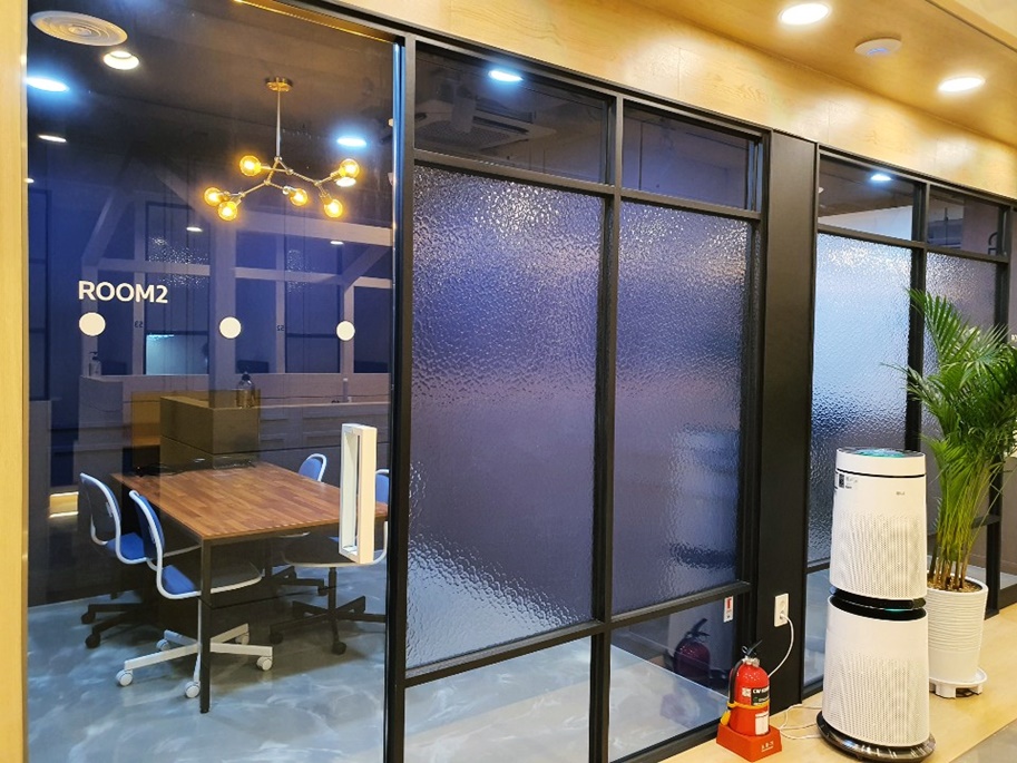 글래스월을 적용한 그룹스터디룸입니다. 그룹스터디룸 역시 여러 명이 함께 공부를 하면서 긴장을 해소할 수 있는 공간으로 클래식 블루를 적용해 영역별 통일성을 주었습니다. 물론, 벽면에는 그룹스터디룸에 적당한 수준의 방음재를 넣었으며 투명한 유리와 불투명 유리를 매치해 개방성과 독립성을 모두 부여했습니다.