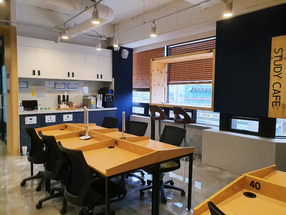 휴식을 취할 수 있는 공간에는 익스테리어의 클래식 블루 컬러를 적용하고 스터디를 할 수 있는 공간은 우드와 화이트를 적용해 영역성을 부여했습니다. 책상에는 개별 콘센트를 장착해 전자기기 충전과 스탠드 조명 사용이 가능하도록 했으며 파티션을 낮게 적용해 공간의 답답함을 줄였습니다.