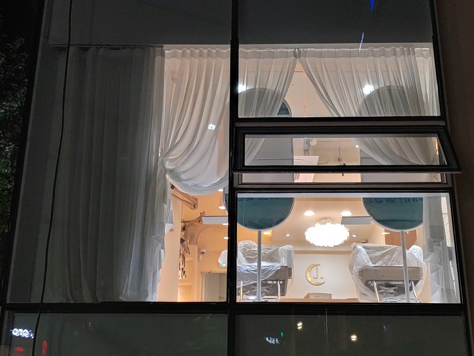 입구 파사드입니다. 통유리창으로 내부가 훤히 보이는 모습인데요, 미용실의 파사드는 예쁜 미용실이면서 방문하고 싶은 마음이 생기도록 만들어줘야 합니다. 그런 의미에서 내부를 볼 수 있는 블랙 프레임의 통유리 창은 최적의 익스테리어가 아닐까 합니다. 물론, 내부 인테리어가 예뻐야 효과가 있다는 것은 당연한 것이고요.